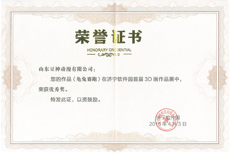 《龜兔賽跑后傳》2015年4月獲濟寧軟件園首屆3D畫作品展優(yōu)秀獎