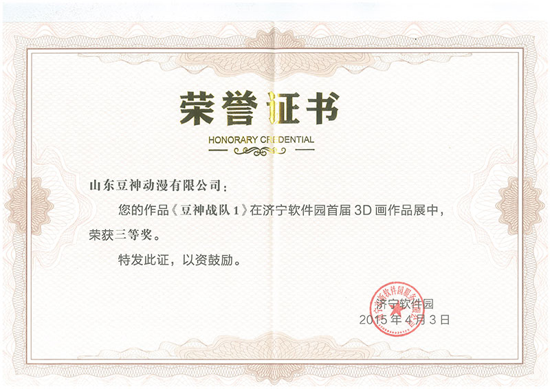 祝賀《豆神戰(zhàn)隊》2015年4月《豆神戰(zhàn)隊1》和《豆神戰(zhàn)隊2》分獲濟寧軟件園首屆3D畫作品展三等獎