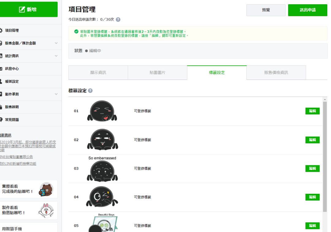 最后你可以點(diǎn)右上角的預(yù)覽來(lái)查看你的表情包效果,沒(méi)問(wèn)題了就點(diǎn)送出申請(qǐng),等待審核,不過(guò)LINE的審核整體很快,有的一天就能審核通過(guò)。